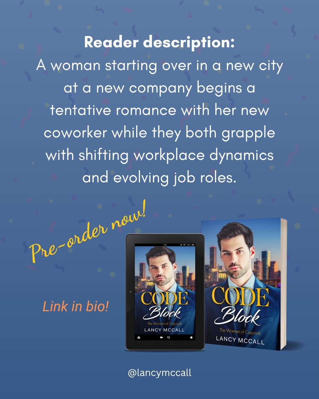 Code Block, book two of my Women of Caprock series, is now available for pre-order. And release day (August 15, 2025) is right around the corner! For a limited time, the ebook will be available on all major platforms (Amazon, Apple, Barnes & Noble, Google Play, and Kobo).